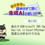 Microsoft 365のCopilot in Excelが進化し、Excel上で直接Pythonを使った高度な分析が可能になりました。従来はテーブル化が必要など使いにくさがありましたが、現在はそのまま起動できます。「世界の統計2025」のデータを例に、Copilotが「数式の作成」や「色と書式設定」を提案・適用する様子が紹介されています。これにより、年平均増加率の算出や特定の条件(1億人以上)のセルを強調表示するなど、データ分析が容易になりました。